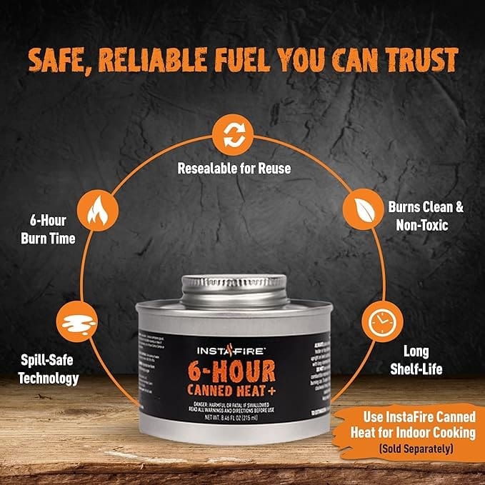 Includes: 3 InstaFire 6-Hour Canned Heat (odorless, smokeless, non-toxic fuel). Always ensure adequate ventilation when in use.